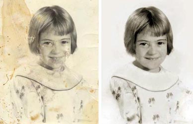 Restore Those Old Family PhotosWe automatically run a basic contrast and color enhancement on every photo we preserve for you.But sometime pictures need more advanced photo first aid. Photos and Polaroids fade and crack. Then there's mold, ink bleeding through from the back of the picture, rips, water marks and even coffee stains. Some require moderate restoration, others require extreme restoration: Here are a few examples of what's possible with moderate restoration: